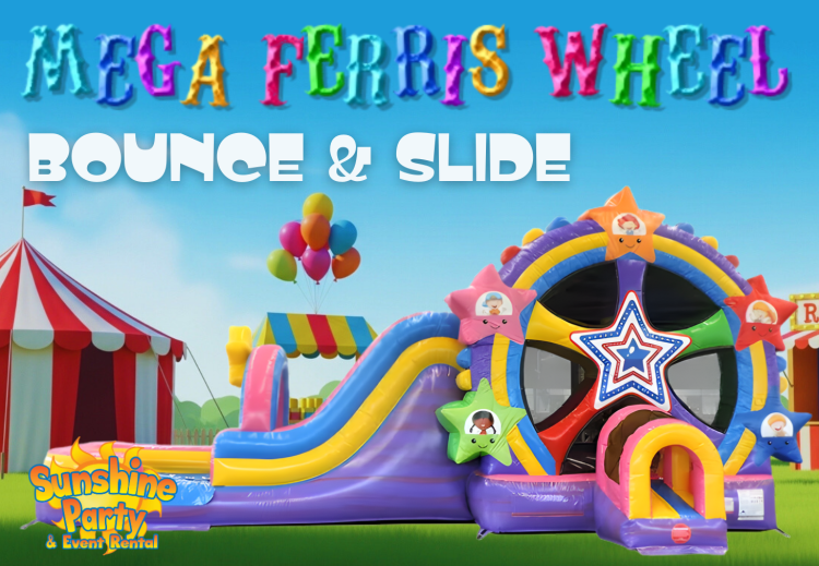 The Mega Ferris Wheel Bounce and Slide is a large, eye-catching inflatable combo that brings the thrill of a carnival ride to any backyard party or event. Designed for kids and families, it combines a spacious bounce area with an attached climbing zone and a fun, gently sloping slide, all built into a colorful Ferris wheel–themed structure that serves as both play space and party centerpiece. The bounce floor gives plenty of room for active jumping, the reinforced climbing ladder provides safe access to the slide platform, and the slide itself features high side walls and an extended landing pad for smooth, cushioned exits. Built with heavy-duty, puncture-resistant material and commercial-grade stitching, this unit is made to handle repeated use and keep children contained with mesh safety panels for parent visibility. It sets up on a flat surface, requires a standard electric blower to stay inflated, and is anchored with stakes or sandbags for stability. Ideal for birthdays, school events, and community fairs, the Mega Ferris Wheel Bounce and Slide offers a festive look, multi-activity play, and reliable safety features that make it a crowd-pleasing rental option.